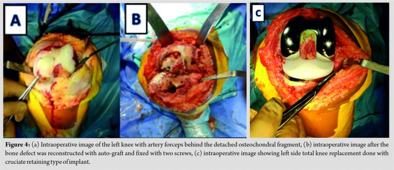 Taking the deformity and disability into consideration, total knee replacement (TKR) was planned for both sides. Initially, left knee was operated. Large longitudinal osteochondral flap was seen intraoperatively on MFC’s extensor surface. The MTP was depressed and cartilage fibrillation was seen. After excising the flap, there was defect seen in medial condyle with sclerotic bone at base. An auto-bone graft obtained after cutting posterior condyle was used to build up the defect (Fig. 4).