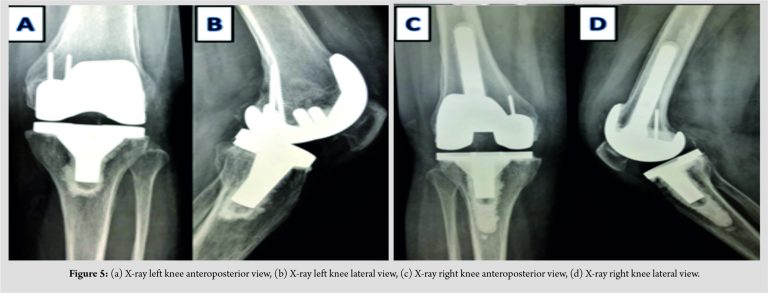 Conclusion: Concomitant SPONK of MFC and MTP in bilateral knee is very rare and in advanced stages TKR can provide good radiological and functional outcome. Furthermore, pre-operative assessment of bone defects is necessary and appropriate use of augments (extender stem or metal wedges) is crucial.