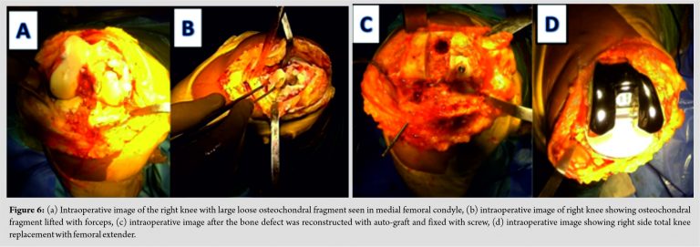 Two weeks later, right side TKR was done. MFC of right side also had a large osteochondral fragment which was excised to leave defect with depth more than 5 mm. This defect was reconstructed with bone graft obtained from posterior cuts. MTP of right side had similar findings as left side (Fig. 6).
