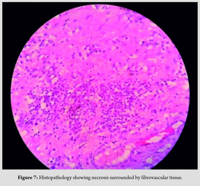 Posterior stabilized type of knee replacement component was used along with femoral extender stem (Fig. 5).Histopathological examination was done of the excised osteochondral fragments and tibial cuts. It revealed necrotic bone, surrounded by an area of fibrovascular granulation tissue on both the femoral and tibial sides (Fig. 7). Patient was mobilized full weight bearing after surgery and has good functional outcome at 2 years follow-up.