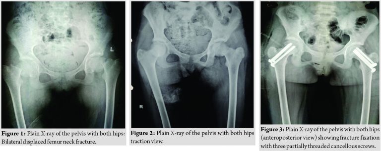 Introduction and patient information: An 11-year-old girl was brought to pediatric emergency for the assessment of fever with generalized tonic-clonic seizures and inability to walk. Her serological evaluation revealed hypocalcemia and hyperphosphatemia (Table 1). Workup for fever was normal which subsided on antipyretics. Radiological examination of hip showed bilateral displaced femur neck fracture (Fig. 1, 2).