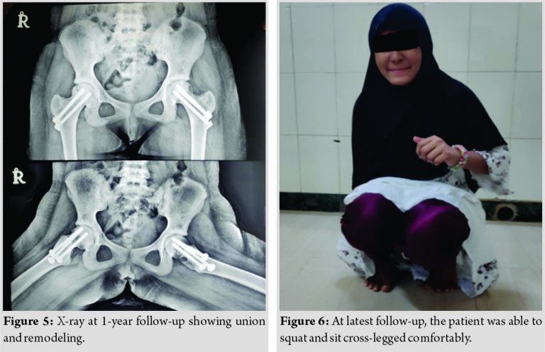 Follow-up and outcomes: Postoperatively, hips were kept in abducted position with abduction bar. She was kept nil weight-bearing for 3 months. At latest 1-year follow-up, she was able to sit cross-legged and squat [Fig. 5, 6].