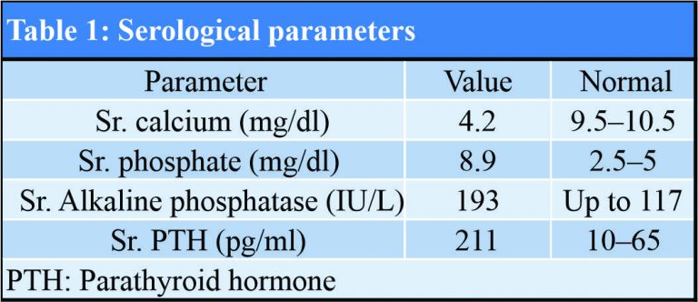 Clinical findings, timeline, and diagnostic assessment: The diagnosis of pseudohyperparathyroidism was made and the patient started on oral calcitriol 0.25 mcg daily along with oral calcium. She was born of non-consanguineous marriage full-term normal pregnancy with no immediate neonatal problems. She had received adequate sun exposure with appropriate development (weight and height for age was within normal percentile range) and no signs of liver/renal disease with no dysmorphic features. Biochemical investigations revealed normal complete blood count, Sr. Vitamin D3 levels, Sr. TSH, free thyroxine (Ft4), urinary calcium/creatinine ratio, liver and renal functions, and arterial blood gas. However, serum calcium was low, while phosphorus, alkaline phosphatase, and PTH levels were elevated, (Table 1).