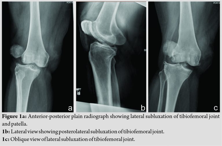 A 51-year-old morbidly obese female presented to the emergency department of our facility after sustaining a fall from standing height while at home. She described a rotatory mechanism and an inability to bear weight on her right lower limb due to pain and instability at the knee. On examination, the invagination of the skin was noted at the medial joint line of the knee in a characteristic dimple sign. Posterior tibial and dorsalis pedis pulses were palpable bilaterally at 2+ and 1+, respectively, with no signs of hypoperfusion to the right foot. All compartments were soft, and no pain with passive range of motion was noted at the ankle and foot. Sensory and motor innervation was intact. Ankle-brachial indices (ABIs) of bilateral lower extremities were documented at 1.10. Neurovascular status was closely monitored throughout the patient’s stay. Further, vascular studies, such as angiography, were deferred. Radiographs revealed lateral subluxation of the tibiofemoral joint with a wide medial compartment and lateral dislocation of the patella (Fig. 1a, 1 b, 1c).