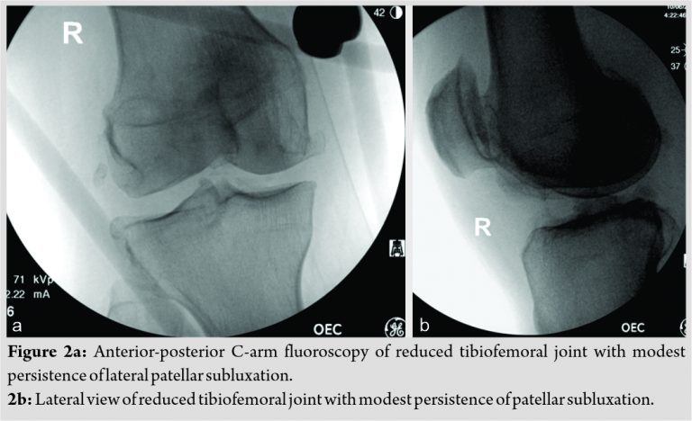 The emergency room physician urgently sedated the patient and the orthopedic trauma team, which was inclusive of a junior and senior resident as well as the attending surgeon, performed several attempts at reduction. The reduction technique employed consisted of traction and counter-traction with a force directed to correct the deformity. A lateral-to-medial force failed to reduce the patella. After unsuccessful closed reduction, the patient was transported to the OR for closed versus open reduction under general anesthesia. She was placed supine on the table with a bump under the right hip and with her right leg slightly flexed on a foam pad. The leg was prepped in the usual sterile fashion and before the incision was made, the hip was flexed, and the knee was flexed to 120 with internal rotation of the limb. A large valgus force was applied at the distal thigh, as described by Tateda et al. [7]. The dislocation was reduced, and the dimple sign disappeared. The limb was brought out to extension and reduction was confirmed with fluoroscopy in the anterior-posterior and lateral views. Some lateral subluxation of the patella remained (Fig. 2a, 2b). It was felt that this maneuver allowed the medial femoral condyle to be pulled back through the buttonhole in the medial retinaculum.