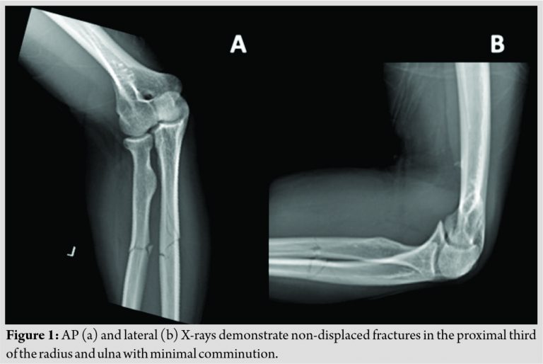 A 23-year-old, Caucasian, right hand dominant male, otherwise healthy, was seen in the emergency department after a skateboard accident. He reported falling onto his dorsal left proximal forearm and experienced immediate pain in the area without other injuries. Physical examination was notable for tenderness over the proximal radius and ulna and limited pronosupination secondary to pain. Plain radiographs demonstrated non-displaced but slightly comminuted, short oblique fractures of the proximal third of the radius and ulna (Fig. 1a, b). After discussion with the patient and his family, the decision was made to place the patient in a long arm cast (Fig. 2a, b) and follow-up in the clinic in 1 week.
