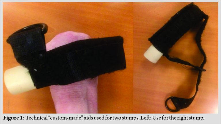 We report the case of a 72-year-old female patient, retired, right-handed, and non-smoker 1.62 m tall – 54 kg. This patient resided in an assisted living facility accommodating those with mental health disorders, presented with a history of osteoporosis, known chronic psychiatric illness with well-controlled symptoms, along with attempted suicide 12 years prior that led to forearm amputation in her left upper limb and transmetacarpal amputation of the right one (she threw herself under a train). Despite this disability, the patient used her arms every day to eat or do her hair, employing technical aids fabricated by an occupational therapist, which allowed her to secure cutlery, combs, and other items to her forearm (Fig. 1). Due to the psychotic medication, she had a pre-operative estimated lack of extension of the elbow of 80° due to spasticity (fixed flexion deformity with further flexion).