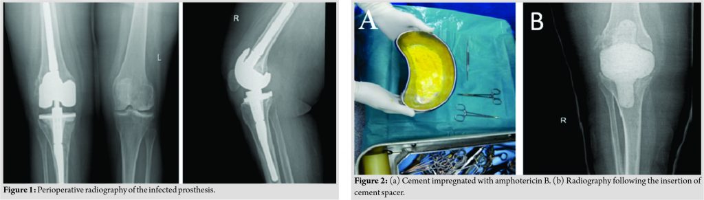 However, 9 months following the two-stage revision TKR, the patient presented with the right knee pain, swelling, and hotness. The physical examination revealed redness, hotness, restricted range of movement, and tibial loosening which called for the admission of the patient. The patient’s complete blood count, kidney function tests, liver function tests, and chemistry were all sent for laboratory analysis refer to Table 1 and Fig. 1whichshow the prerioperative radiographs. Right knee soft-tissue excision showed fibrofatty tissue with inflammatory infiltrate and fibrin. Necrotic bone periodic acid–Schiff (PAS) stain was negative for fungal spores and pseudohyphae. Right knee synovial fluid aspirate showed sheets of neutrophils in hemorrhagic background. PAS stain is negative for fungal spores and pseudohyphae, but culture of the joint aspirate showed growth of “C.parapsilosis.” A repeated culture confirmed the presence of the fungal infection. During this admission, the patient underwent the first stage revision of TKR with removal of the infected prosthesis and placement of amphotericin bimpregnatedcement spacer (Fig. 2) and received capsofungin 50mg, fluconazole 200 mg, imipenam+ cilastin 500mg, ceftriaxone 1g, levofloxacin 500mg, and vancomycin 500mg for 40 days and then was discharged on fluconazole 150 mg 1*1 for 6 weeks. Knee aspirate culture demonstrated no fungal presence 2 weeks post-anti-fungal treatment.