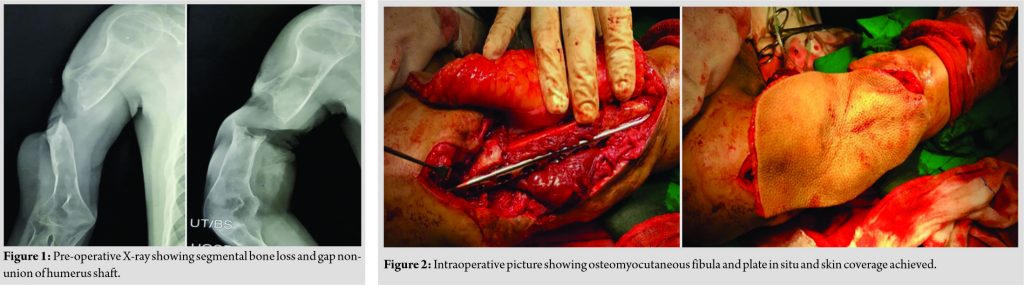 Introduction: Non-union of closed humerus fractures is estimated to be about 5.5% and this figure is even higher in open fractures. In cases of non-union of the humerus with segmental bone defect, if a conventional treatment has failed, free fibular transfer is often considered for satisfactory bone union. In some cases, where there is severe scarring due to multiple previous surgeries. In such cases, skin cover may not be adequate and tight closures often lead to necrosis and failure excision. Segmental bone defects of the upper limb that is >6 cm with soft-tissue coverage defects have limited options for reconstruction. Osteomyocutaneous fibula may provide to be a valuable option in such cases.