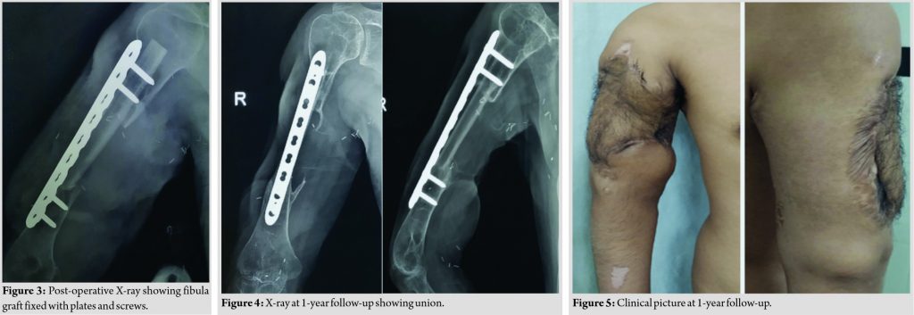 Surgical technique involved approach of both upper and lower limbs simultaneously, with the patient in the supine position. The humeral approach was based on the previous incisions and soft-tissue defects. For non-union, necrotic bone was resected and debridement done, the ends were reamed sequentially to open the canal and to allow the fibula to go inside the humerus medullary cavity. The brachial vessels were identified for anastomosis. The osteomyocutaneous fibular graft was based on the peroneal vessels. The harvested flap included skin paddle, fibula, skin perforators (majority present on the inferomedial part of the fibula), and the peroneal vessels with the venae comitantes. A length of 16 cm and a width of 12 cm of skin flap were harvested along with 9.5 cm of fibula bone. The graft was inserted 2 cm at each end into the humerus, and then, the entire construct was fixed with a 4.5 mm low contact dynamic compression plate with two screws on either side getting four cortex purchase. The peroneal artery was anastomosed end-to-side with the brachial artery. The skin margins of the flap were fashioned accordingly and were sutured to the surrounding skin (Fig. 2, 3). Postoperatively, flap was closely monitored for vascularity and viability and the fixation was protected by a U slab, which was later converted into a functional humerus brace. Physiotherapy started with range of motion and followed by muscle strengthening. Serial X-rays were taken to assess bone union at 6 months and 1 year (Fig. 4, 5).