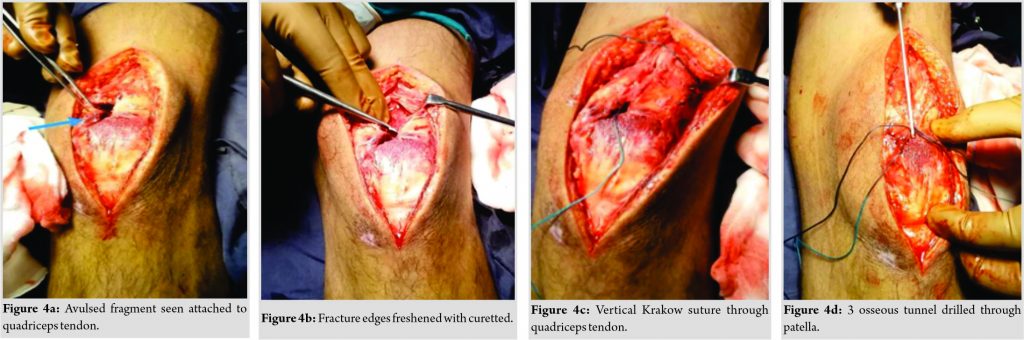 The avulsed fragment was comminuted and was not big enough to allow screw fixation. Surgery was planned as due to discontinuity in quadriceps mechanism patient was unable to extend the knee actively and perform straight leg raising.