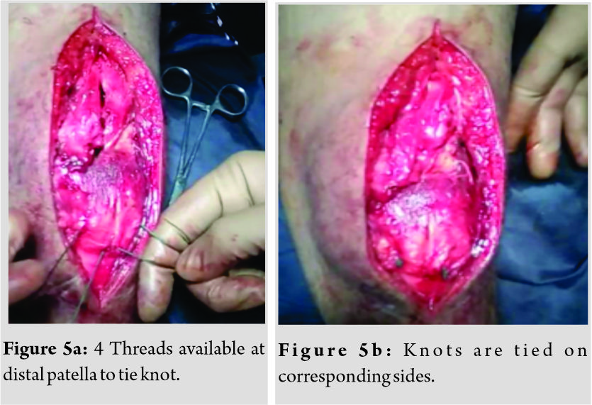 The fracture edges were freshened (Fig. 4b). In four vertical rows with no.3 Krakows sutures were taken incorporating fracture fragments [Figure 4c]. From four polyester suture rows now 4 thread ends were available [3]. Tunnels were drilled in patella in proximal to distal direction (Fig. 4d). The medial threads are pulled out of middle tunnel and the lateral threads are pulled out of corresponding lateral tunnels [Figure 5a]. On the distal end of the tunnels the medial thread ends are passed through the soft tissue to the corresponding lateral threads to avoid placing knots on anterior aspect. Tight knots were taken to ensure good opposition at fracture site (Fig. 5b).