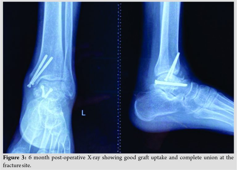 The patient was advised non weight bearing mobilization for 4 weeks. Partial weight bearing mobilization started at 5 weeks postoperatively, while full weight bearing mobilization was not done until 3 months postoperatively. Serial radiographs were procured at 3rd and 6th month postoperatively (Fig. 2, 3). The 6th month post-operative radiograph of the patient showed features of complete union of the fracture. Clinically, the patient had no symptoms with full ankle range of movements.