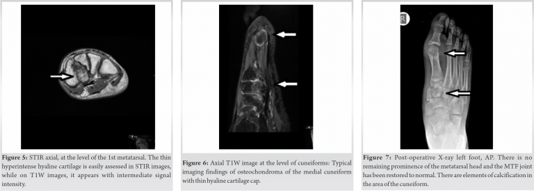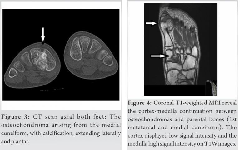 Conclusion: Solitary osteochondroma can present in the cuneiform and metatarsal of a growing adolescent. CT scan is useful for the accurate diagnosis and surgical removal of the tumor.