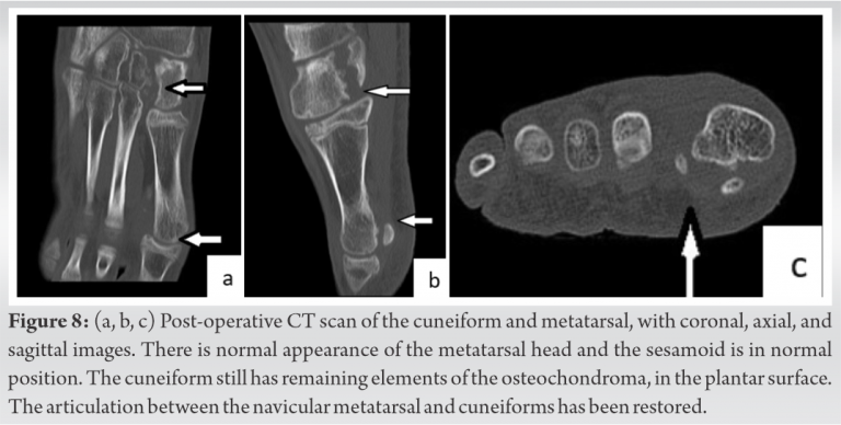 Both specimens were sent for pathologic examination confirming the diagnosis of two osteochondromas. Our patient had an uneventful recovery, with a 4-week period of partial weight-bearing. He is being regularly evaluated in our clinic. Six months after the operation, he stated that he could easily participate in football activities, playing for his city team. A post-operative X-ray and CT scan were performed showing restoration of the shape of the 1st metatarsal with normal position of the sesamoids. In the area of the cuneiforms, remnants of the osteochondroma were found in the plantar surface.