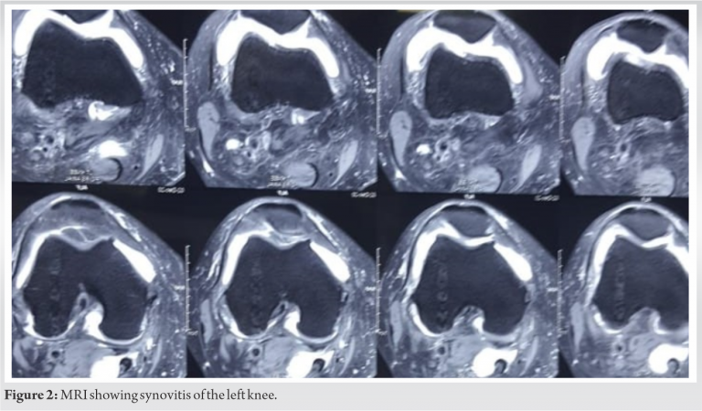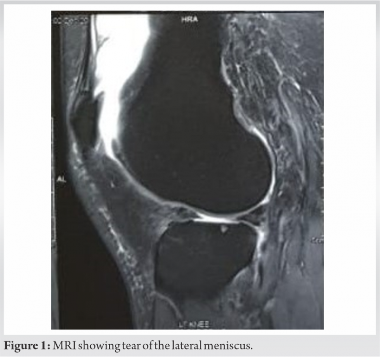 A 50-year-old woman came with chief complaints of pain and swelling in the left knee. She had a recent history of twisting injury while walking. Physical examination revealed tenderness along the lateral joint line and McMurray’s test was positive for lateral meniscus. Flexion was terminally restricted and painful. Radiographs showed evidence of lateral compartment osteoarthritic changes. Tear of lateral meniscus (Fig. 1) along with synovitis (Fig. 2) and degenerative changes in the cartilage were evident on magnetic resonance imaging (MRI) of the left knee. Arthroscopic partial meniscectomy was planned on the basis of her clinical and radiological presentation.