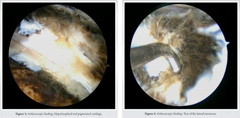 Arthroscopic findings revealed hypertrophied and pigmented synovium (Fig. 3). There were small chondral defects of size 3 mm to 5 mm, Grade 2+ more over the lateral condyle than the medial condyle. There were pigmented loose bodies with size varying from 0.5 mm to 5 mm. Grade 3 changes were observed in the cartilage with kissing lesions and greyish-blackish discoloration. Both the menisci were discolored with tear in the lateral meniscus (Fig. 4). Although the integrity of all the ligaments was maintained, there was evident discoloration and thinning out.