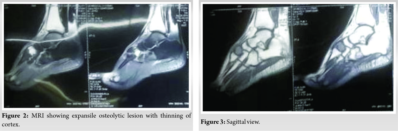 A 25-year-old female presented to our patient clinic with complaints of pain and swelling over the dorsum of her right foot for a period of 1 year. Swelling was insidious in onset, gradually progressive and reached the present size. Pain was insidious in onset, intermittent, moderate intensity, dull aching, no radiation, aggravated by walking, and relieved with medications. There is no history of fever, trauma, loss of weight, and loss of appetite. The patient had no other medical comorbidities.