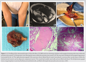 Benign vascular tumor was suspected and surgery was performed under general anesthesia. A pneumatic tourniquet was applied to the upper left arm. We used a 6 cm vertical incision centered on the pronator teres. The mass had a lobulated appearance surrounded by fat located within the humeral head of the pronator teres muscle (Fig. 1c). Tumor limits were clear. It was dissected carefully and excised totally. An afferent vessel was found and ligated. No adherence to adjacent structures and the profound fascia was found. No contact with the ulnar nerve was observed. The mass size was approximately 30x20x10mm with firm consistency (Fig. 1d). Histopathological examination of the excised mass revealed a proliferation of benign vascular channels within skeletal muscle, associated with a mature adipocytic component. The tumor is composed of mixed vessel types, including lymphatics, large thick-walled veins, and dilated vascular channels. Furthermore, there are cavernous-like spaces, an arteriovenous component, and some thick-walled veins in the tumor. Areas with the cavernous lymphatic component are predominant. These vascular spaces were filled with blood or lymphatic fluid. Some vessels display thrombosis, with occasional formation of phleboliths attested by the presence of calcification. There was no evidence of cytonuclear atypia or mitosis (Fig. 1e).