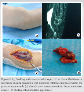 Plain radiographs of the left elbow were normal. MRI showed a well-margined intramuscular mass of 30 mm within the pronator teres muscle (Fig. 2b).