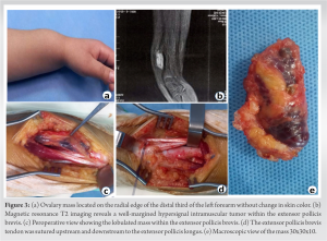 We used an 8 cm vertical incision on the posterior aspect of the distal forearm (Fig. 3b). The mass had a lobulated appearance surrounded by fat located within the extensor pollicis brevis muscle in its musculotendinous junction. Tumor limits were clear (Fig. 3c). The extensor pollicis brevis muscle was excised partially with its tendon. The remaining tendon was sutured upstream and downstream to the extensor pollicis longus (Fig. 3d). The thumb was immobilized using a thumb spica splint. Histopathological examination of the excised mass revealed a cavernous hemangioma.