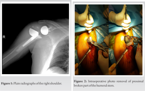 A 55-year-old male applied to our clinic with a sudden pain in his right shoulder, 2 years after a reverse total shoulder arthroplasty (RTSA) in another hospital due to rotator cuff arthropathy. He was a gardener and returned to his work after 2 months of the operation. His range of motion (ROM) was improved and had no pain in his daily activities after several months. However, almost 2 years from the initial surgery, he suddenly felt extreme pain in his shoulder when he tried to operate a vacuum cleaner. He applied to our clinic after trying painkillers for 3 weeks. A sharp pain in the shoulder, restrained ROM, and a loosening-like feeling were his major complaints at his admission with a normal neurovascular examination and without any comorbidities. Plain radiographs of his shoulder were taken and a RTSA with a broken humeral stem was determined (Fig. 1).