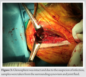 Further evaluation was done with a computed tomography of the right shoulder to evaluate any occult fracture around the shoulder girdle and bony fracture was excluded from the study. A one-stage operation was planned for revision. We used the previous incision line for the deltopectoral approach. After reaching the glenohumeral joint, the prosthesis was found to be dislocated and broken at the humeral tray of proximal stem. The model itself was a modular stem and due to the suspicion of infection, samples were taken from the surrounding synovium and joint fluid. Metallosis and debris tissue were debrided. The humeral stem and the glenoid hemisphere were removed with its cement (Fig. 2 and 3) and a cemented long humeral stem (SMR, Lima LTO, Udine, Italy) was placed (Fig. 4).
