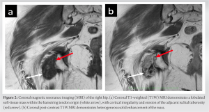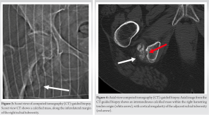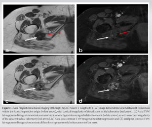 X-rays taken at an external medical institution displayed soft-tissue calcification in the region of the ischial tuberosity, extending just distally into the right ischial tuberosity. This prompted further investigation through MRI. A review of the axial MRI findings (Fig. 1) revealed a well-defined, lobulated heterogeneous soft-tissue mass measuring 6.9 × 3.1 × 2.7 cm within the origin of the right hamstring tendon. The mass exhibited intermediate signal intensity on T1-weighted (T1W) sequences, resembling the signal intensity of skeletal muscle, with some areas of decreased signal intensity. Post-contrast T1W fat-saturated sequences showed intermediate signal intensity with no surrounding edema (Fig. 1d). The lesion extended toward and caused cortical irregularity of the adjacent right ischial tuberosity, which was evident on coronal MRI (Fig. 2). Post-contrast imaging demonstrated solid heterogenous enhancement of the soft-tissue mass, along with scattered areas of low signal intensity on T1W sequences, due to intralesional calcifications (Figs. 1 and 2). To further investigate the mass, a CT-guided biopsy was performed, and the scout view (Fig. 3) showed lobulated calcified mass near the right ischial tuberosity.