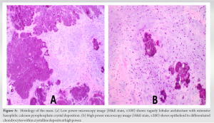 “Calcified chondroid mesenchymal neoplasm” (CCMN) is a newly coined term used to classify a group of chondroid-forming neoplasms that harbor fibronectin 1 (FN1)-receptor tyrosine kinase fusions. These neoplasms encompass entities such as chondroblastoma-like soft-tissue chondromas and chondroid tenosynovial giant cell tumors (TGCTs) [1]. Histologically, CCMNs exhibit a lobular, multinodular architecture characterized by irregular and lace-like calcifications, as well as increased cellularity at the periphery of the nodules. The tumor cells demonstrate a stellate to polygonal shape, with moderate eosinophilic cytoplasm and nuclei eccentrically located within the chondroid matrix. Notably, certain cases of grungy calcifications exhibit features consistent with calcium pyrophosphate deposition (CPPD) [1].
