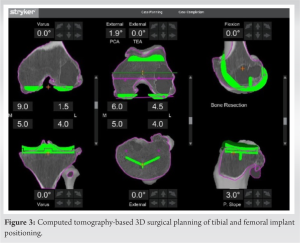 Extensive pre-operative planning was undertaken to address the technical challenges faced by this case. Planning objectives were to aim for a CR construct to minimize bone resection (Fig. 3). Alternative plans were made for stemmed posterior stabilized (PS), and total stabilized (TS) constructs with the use of femoral stem as needed. Pre-operative CT scanning was performed using the standard RA-TKA protocol (Stryker Mako, Mahwah, NJ). CT characterized a cystic lesion measuring 5 cm in its axial dimension. The resulting anatomical models demonstrated severe medial and lateral compartment osteoarthritis with genu valgus alignment.