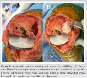 Robotic-assisted TKA offers an attractive alternative for large femoral cystic lesions, optimizing component positioning, fixation, and bone stock preservation.