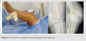 We present the case of a 58-year-old female patient with complaints of bilateral knee pain for 4 years. The pain severity increased on the left side, accompanied by the onset of stiffness and deformity that progressively worsened over time. At present, the patient experiences severe limitations in the range of motion and has been reliant on a wheelchair for the past year. There is no history of inflammatory arthritis. During the clinical examination, the patient exhibited a fixed flexion deformity of 40° in the left knee with an additional free flexion up to 60°. Radiograph revealed end-stage arthritis on the left side in the anteroposterior view (Fig. 1). However, it should be noted that the anteroposterior view did not provide an accurate representation of the sagittal plane deformity, which was approximately 40°. Pre-operative investigations for inflammatory arthritis yielded negative results.