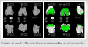 The patient presented with poor knee scores, including an Oxford Knee score of 11, a Knee Society score of seven, and a Kujala score of 38. After evaluation, we determined that a total knee replacement using the Stryker Triathlon system, with the assistance of Mako Robotic Technology, was the most appropriate course of action. As part of the robotic planning process, a pre-operative computerized tomography scan was done to facilitate precise surgical planning (Fig. 2).
