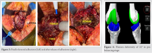 The surgical procedure was carried out with the patient under combined spinal and epidural anesthesia, with the application of a tourniquet. A medial parapatellar approach was utilized to access the left knee joint. Extensive intra-articular and patellofemoral adhesions were observed (Fig. 3). These adhesions were carefully and gradually released, resulting in the restoration of flexion up to 90°. After performing all possible releases, it was observed that the static limb deformity of the patient was 7° of varus and 32° of flexion deformity (Fig. 4).