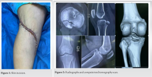 A 32-year-old female had a fall from a two-wheeler and sustained an injury to the left knee. She presented to us with knee pain and an inability to bear weight. She had diffuse pain over the knee with a contusion on the anterior knee. She had posterior tibial sag and the posterior drawer test was positive. The varus and valgus stress tests were comparable with the opposite knee. The range of movement was from 0° to 90° with further movement painful. The dial test was negative at 30° and 90°. The radiograph and the computed tomography scan were suggestive of posterior tibial rim fracture along with PCL avulsion fracture from the tibial insertion (Fig. 1).