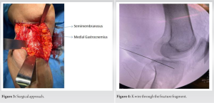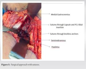 The patient was planned for open reduction and fixation. The patient was operated on under regional anesthesia in a prone position with a tourniquet over the proximal thigh. A lazy S-shaped skin incision was placed over the popliteal fossa with a horizontal limb over the fossa and vertical limbs over the lateral distal femur and proximal medial tibia (Fig. 2). The dissection was between the medial gastrocnemius and semimembranosus (Fig. 3) as suggested by Burke and Schaffer. Deep into this plane, the popliteus muscle was seen and elevated from the proximal tibia. The posterior capsule of the knee joint was identified along with the avulsed tibial fragment. The fragment was initially stabilized with a K wire (Fig. 4). Then, four high tensile sutures (Fiber wire No. 2, Arthrex, Naples, Florida) were passed through the posterior capsule and PCL at their tibial insertion on the avulsed fragment (Fig. 5).