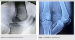 A knotless fixation was planned with two swivel lock PEEK anchors (4.9 mm, Arthrex, Naples, Florida). Two drill holes were made and the drill holes were tapped for the passage of anchors. The sutures that were passed through the capsule and PCL were then passed through the anchors, with two sets of sutures through each anchor. The anchor along with the sutures was threaded through the posterior tibial cortex with sutures in tension and the K wire was removed (Fig. 5). The reduction was checked under the image (Fig. 6) and the tourniquet deflated. The wound was washed and closed in layers. A posterior knee plaster was applied with a proximal tibial posterior padding to prevent posterior sagging. The patient was started on isometric quadriceps exercises from day 1 and non-weight-bearing crutch walking was also started. At 2 weeks, the plaster was removed and sutures were also removed.