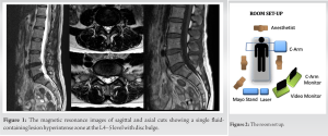 A 44-year-old man presented to the outpatient department with a 12-month history of low back pain. His back pain had increased progressively. At the time of presentation, his back pain VAS score was 7/10 and his ODI score was 44. He had received non-steroidal anti-inflammatories for more than 6 months and an epidural injection elsewhere with minimal relief from symptoms. On physical examination, power in the lower limbs was 5/5 as per the MRC grading, and deep tendon reflexes were normal too. The past, personal, addiction, or familial history was not significant. The magnetic resonance (MR) images showed a single fluid-containing lesion with a hyperintense zone at the L4–5 levels (Fig. 1). After adequate counselling with an explanation of the pros and cons of the procedure and its probable complications, the informed consent of the patient was taken, and the patient was planned for the SELD procedure.