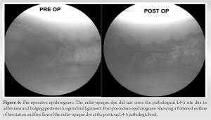 The patient’s pain and neurological symptoms kept improving on post-procedure days 1, 2 weeks, 1 month, and 6 months. There was a rapid relief of pain on day 1, and VAS improved from 7 to 1. At 6 months of follow-up, the VAS score was 0 and the ODI improved from 50 to 19. These results were maintained at a 2-year follow-up with a telephone conversation. Patient satisfaction was surveyed using Odom’s criteria at each follow-up visit (at 1 week, 1 month, 6 months, and 2 years) and found to be excellent. These cases demonstrated no early or late complications in terms of neurologic deficits, infection, or epidural hematomas.