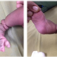 A 2-day-old Caucasian male infant born at 27 weeks gestation through emergency cesarean section due to concern for placental abruption and premature rupture of membranes in the setting of a prenatal history significant for oligohydramnios. On examination, the neonate exhibited evidence of congenital amniotic band syndrome and a constellation of orthopedic anomalies, including a congenital below-knee near amputation of the right leg with approximately 1 cm of nonviable residual limb tissue with exposed tibia and fibula. The left foot demonstrated complex syndactyly, with a nonviable appearance of the second and fourth toes, and a congenital talipes equinovarus deformity (Fig. 1a-c).