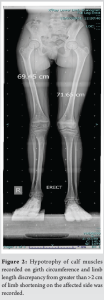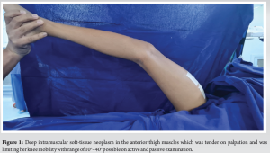 We present an 11-year-old girl with a painful anterior right thigh swelling for 4 years. It began as a painful small lump deep in her anterior mid-thigh region and gradually progressed to a large swelling that caused her severe local pain and limitation of movements at the knee. Her mother noticed a limp with pelvis and shoulders dropping to the affected side while walking and this has progressed over the past year. She had undergone an incisional biopsy which was inconclusive and treated with intra-lesional chemical/sclerosant injection before presentation to our institution. Our clinical evaluation brought to light a deep intramuscular soft-tissue neoplasm in the anterior thigh muscles which was tender on palpation and was limiting her knee mobility with range 10°–40° possible on active and passive examination (Fig. 1). Hypotrophy of calf muscles recorded on girth circumference and limb length discrepancy from >2 cm of limb shortening on the affected side was recorded (Fig. 2).