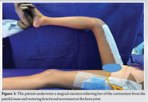 High-resolution ultrasound showed evidence of an ill-defined hyperechoic area within the muscles in the anterior compartment of thigh with few tubular vascular channels within on-power Doppler ultrasound, mostly representing a vascular malformation. A multiplanar multiecho plain and contrast magnetic resonance (MR) imaging of the right has been performed. In addition, MR angiogram of the right has been performed with arterial, venous, and delayed phases of scanning that reported a large heterogeneous intramuscular lesion in the anterior compartment of the right thigh predominantly involving the vastus muscles and sparing the rectus femoris with superoinferior length of approximately 24 cm. Regions of fat infiltration in relation to the muscles may represent the presence of fat component or fat atrophy of the vastus muscles. Additional plain computed tomography scan was also obtained that showed multiple poorly defined T2 hyperintense lobulated compartments with septations and multiple interspersed calcific foci which may represent phleboliths. On MR angiography, few dilated arterial branches from the deep femoral artery supplied the lesion with few areas of early enhancement without evidence of an early draining vein, definite venous shunting, or discrete nidus. Imaging features, phleboliths, and long-standing history of an intramuscular malformation in the young girl that was recalcitrant to treatment at previous attempts led us toward the suspicion of a FAVA rather than a vascular malformation or soft-tissue neoplasm and therefore a biopsy was recommended to confirmation. Pathology confirmed an intramuscular lesion with medium-sized arteries, veins, and lymphatics with intervening fibroadipose and muscle tissue. No evidence of atypia, necrosis, or malignancy was seen. Next-generation sequencing (NGS) was used for sequencing and variant/mutation detection, and a clinically relevant mutation was identified in the PIK3CA gene of the specimen clinching the diagnosis of FAVA. Keeping with the recommendations for management of FAVA as reported literature, the patient underwent a surgical excision relieving her of the contracture from the painful mass and restoring functional movement at the knee joint (Fig. 3).