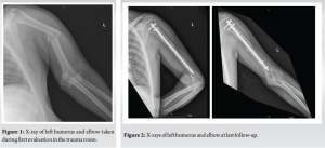 Our patient is a previously healthy 36-year-old man who fell during his work on a truck from a height of approximately 3 m. He was brought to the trauma room in our hospital with an isolated left upper extremity injury. He was diagnosed with a humeral shaft fracture, head of the radius fracture, and elbow dislocation, all on the left side (Fig. 1). He had a puncture wound and abrasions on his medial epicondyle area and proximal medial forearm. No other skin lesions were found. His wound was quickly washed and cleaned, and he received IV antibiotics (cefazolin 2g) under a working diagnosis of a grade I open fracture dislocation of the elbow. His elbow was reduced in the trauma room, and after reduction, placed in a posterior splint. He was admitted to the orthopedic department for definitive fixation.