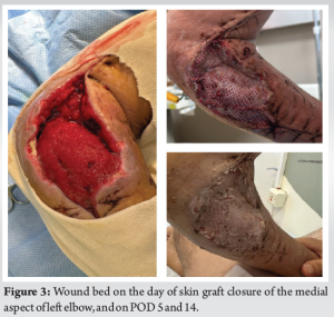 Two days after admission, the patient was taken to the operating room for definitive fixation. His humeral shaft fracture was treated with closed intramedullary nailing) MultiLoc Humeral Nailing System SYNTHES) (Fig. 2). At the time of the procedure, the operating team noted erythema and swelling of the medial aspect of the proximal forearm. The skin was incised and a tract leading into the joint was found, and a purulent discharge was drained from the wound. The wound was left open after copious irrigation of the elbow, and the purulent fluid was sent for microbial analysis. The following day, the soft tissue condition had worsened. Laboratory works at post-operative day 1 resulted in a high white blood count of 20,000 cells/ml and a C-reactive protein (CRP) value of 33.29 mg/dl (normal range 0–0.5 mg/dl). The patient was taken back to the operating room where extensive soft tissue necrosis of the subcutaneous tissue, pronator and flexor proximal muscles, and medial joint capsule were found. Radical debridement was pre-formed and the wound was left open. Cultures were still inconclusive at that point. The patient was still on intravenous cefazolin and was taken back for a third look 48 h later. Five days following the index procedure, cultures came back positive for Clostridium perfringens. After consulting our microbiologist team, IV Penicillin and Clindamycin were administered. The patient was taken back to the operating room for serial debridements circa every 48 h. On POD 17 after the index procedure, a clean, bleeding, and viable wound bed was found, and a partial thickness skin graft was performed (Fig. 3). Lab values at the end of the course were markedly improved with a CRP value of 0.99 mg/DL and normal blood count.