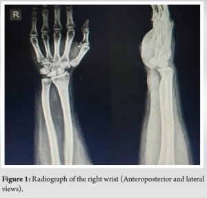 A 29-year-old right-hand dominant female patient arrived at our out-patient department complaints of swelling, pain, tingling, and numbness of the right palm. The patient denied any history of recent trauma, and the cervical spine examination was within normal limits. She had a similar episode 1 year prior, with complaints of moderate wrist pain and mild paresthesia, but without any swelling, for which carpal tunnel release was done elsewhere. The patient was symptom-free after the primary surgery for a year. Still, the symptoms had aggravated in the past 6 months before presenting to us, and complaints were noted around the right wrist, not relieved by analgesics, gabapentin, icing, or elevation. On physical examination, a diffuse swelling of approximately 3 × 4 cm was seen along the wrist’s volar aspect [Zone 5 of flexors]. The swelling was painful on palpation, finger’s range of motion was normal. Still, the wrist had 20° of flexion, 20° of extension, and restricted radial and ulnar deviation, primarily due to pain. Further movement was possible but was painful. Tinel, Phalen, and Durkan tests were attempted which came out positive. Sensations were reduced along median nerve distribution, but the radial pulse was regular. Hematological parameters, as well as radiographs of the right wrist and hand, were normal (Fig. 1). A tenosynovial mass around the flexor tendons located along the carpal tunnel at the level of the distal radioulnar joint, suggestive of PVNS, was discovered on magnetic resonance imaging (MRI), which was performed to further assess the cause of any underlying pathology (Fig. 2). Nerve conduction studies (NCS) showed reduced conduction around median nerve distribution.