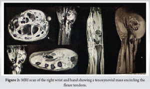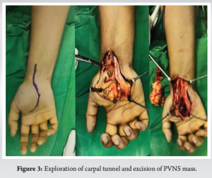 Conclusion: Localized PVNS of the wrist presenting as CTS is a rare condition. To diagnose this illness, several investigations and a high index of suspicion are needed. Total excision of the lesion, along with surgical release of the carpal tunnel, should be ensured to avoid recurrence.