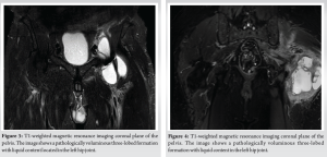 In January 2021, the patient presented with groin and buttock pain at rest and during walking, with limited range of motion (R.O.M) but with no symptoms of inflammation. MRI examination showed the presence of a voluminous three-lobed fluid-filled cyst around the implant (Fig. 3). Synovial fluid was aspirated (23 ml) and four samples were collected for cultures, all of them yielding negative results. In February 2021, the patient underwent arthroscopic synovectomy. After 1 month of follow-up, he underwent a new MRI, which showed the presence of a new voluminous cyst around the implant surrounding the nervous-vascular bundle causing paresthesia on the medial side of the thigh, and showed the same characteristics as the previous one. Subsequently, he was admitted to the hospital and a complete open resection was performed with femoral and obturator nerves neurolysis. Several samples were collected for cultures, all of them yielding negative results. The patient presented good hip function, but complained of persistent groin pain. After 7 months, he underwent 111 Indium-labeled white blood cell bone scan which documented a high leukocyte uptake around the greater trochanter. In October 2021, he underwent a new ultrasound which showed the presence of a new voluminous cyst (50 mm × 15 mm) around the implant with the same characteristics as the previous one. Synovial fluid was aspirated (20 ml) and sent for cultures. Cultures were negative. In November 2021, he was admitted for further examinations. PET-CT showed presence of increased uptake around the ileo-psoas and vastus lateralis muscles. A new ultrasound showed the presence of a voluminous cyst (42 mm × 10 mm) around the implant, and blood test revealed ESR of 42 mm, and C-reactive protein (CRP) level of 0.58 mg/dl. In January 2023, he underwent triple phase bone scan that showed increased activity isolated to the proximal femur around the femoral stem. Since there were no clear signs of infection, an isolated single stage femoral stem revision was performed in February 2023. During the surgery, several swabs were collected and sent for culture. All three samples came positive for S. caprae. As per infectious disease consultant’s recommendations, the patient was treated with 100 mg oral minocycline twice a day for 4 weeks. Two months after surgery, the patient complained of groin and buttock pain. Inflammatory markers were elevated (CRP 47.30 mg/dL), and a pelvis MRI showed a fluid containing formation with the same characteristics as the previous MRI (Fig. 4). In June 2023, he underwent a new ultrasound which showed the presence of a new voluminous cyst around the implant with the same characteristics as the previous one. Synovial fluid was aspirated (18 ml) and sent for cultures. Cultures revealed the presence of S. caprae; susceptibility to rifampin and minocycline was confirmed, which prompted the infectious disease consultant to initiate these antibiotics. The patient started taking 100 mg oral minocycline twice a day and 600 mg oral rifampin once a day. At this time, the decision was made to opt for the two-stage revision prosthesis.
