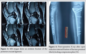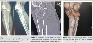 A 34-year-old male was admitted to the emergency department at S N Medical College, Agra, as a case of comminuted fracture proximal tibia and fibula (R) with ipsilateral avulsion fracture of PCL (Fig. 1-4), due to motorcycle-motorcycle collision 3 days before the admission.