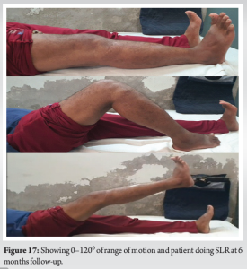 At 6 months after surgery, the ROM was 0–120o. The posterior drawer test showed no instability. Patient was able to do straight leg raise and was able to walk without support. Lysholm knee score was 95 showing excellent result (Fig. 16 and 17).