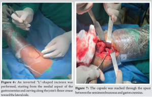 The fascia was cut following the path of the skin incision. The capsule was reached through the space between the semimembranosus and gastrocnemius (Fig. 7). A lengthwise incision was made, exposing the joint at the location of the avulsed fragment. The avulsed fragment was carefully refreshed and realigned. A slight flexion of the knee joint aided in the reduction process. Temporary fixation was achieved using a K-wire to maintain the reduction (Fig. 8 and 9).